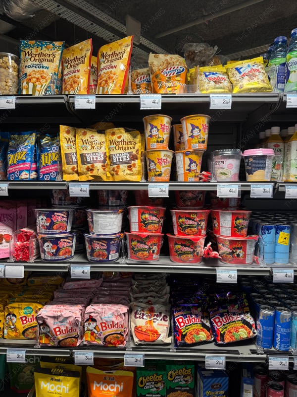 다양한 종류의 불닭볶음면이 파리 마트에 즐비해있어요.